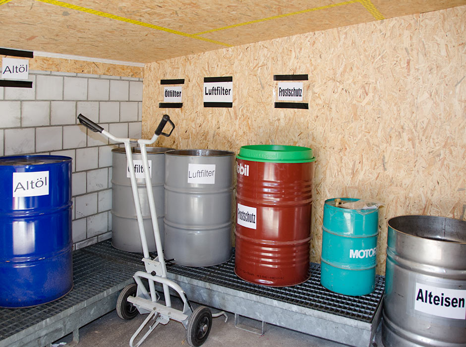 - Flüssigkeiten werden in einem feuerfesten Spezialcontainer mit Auffangwanne gelagert
